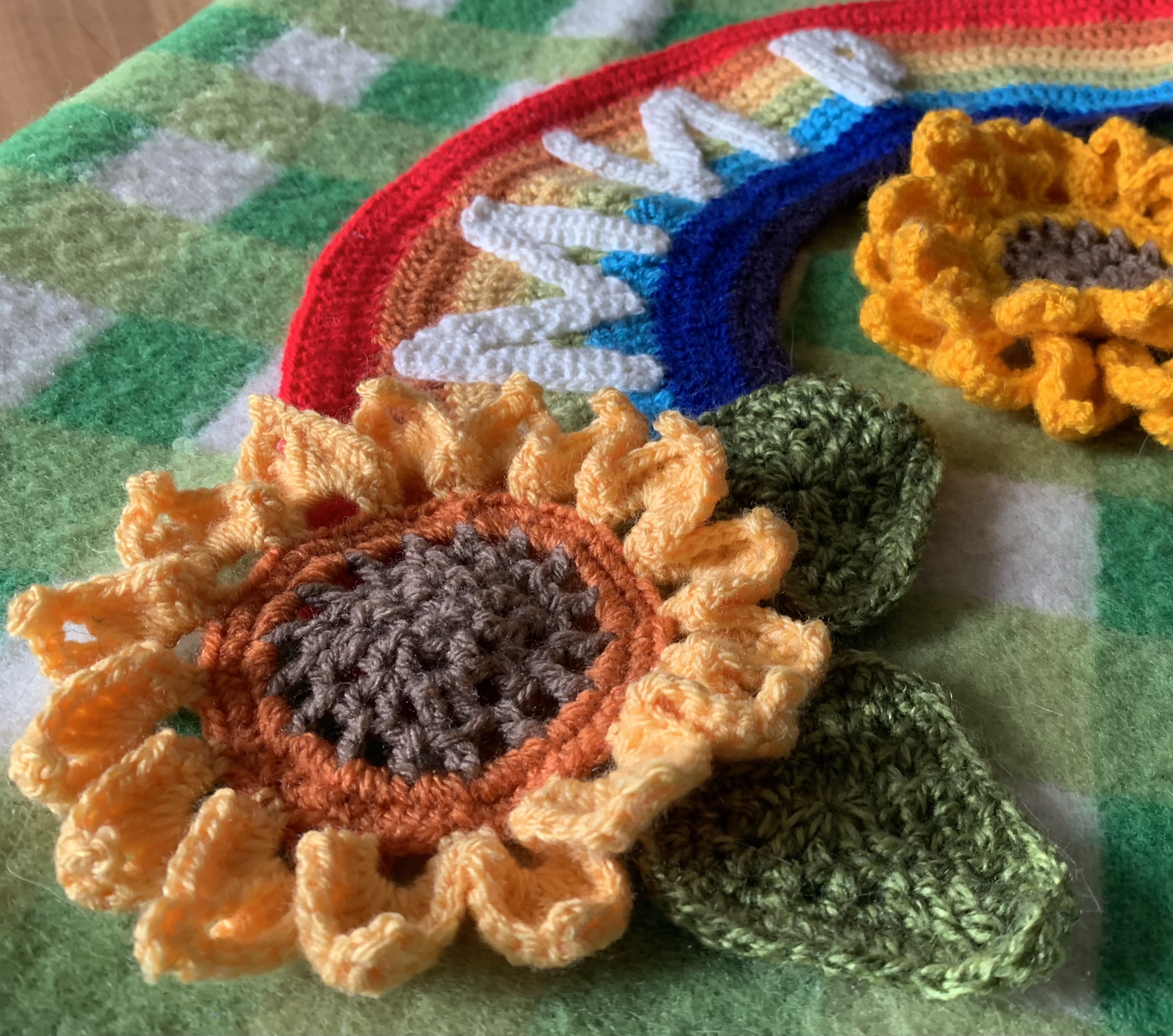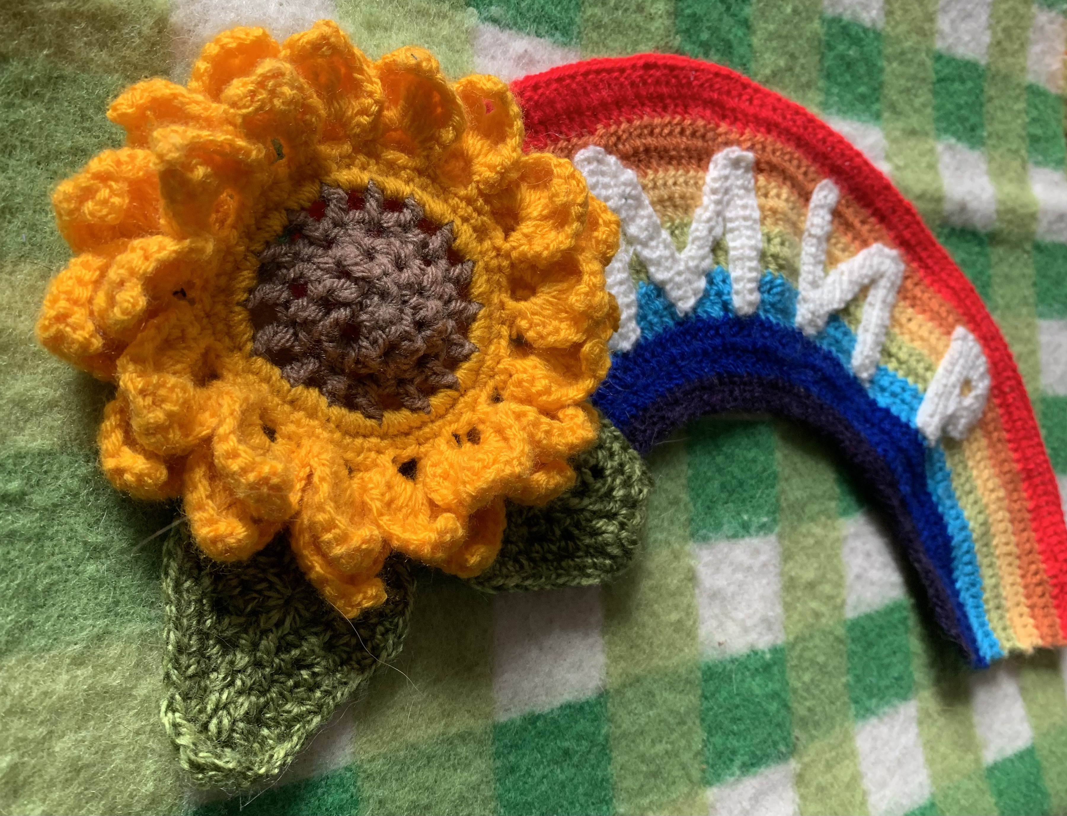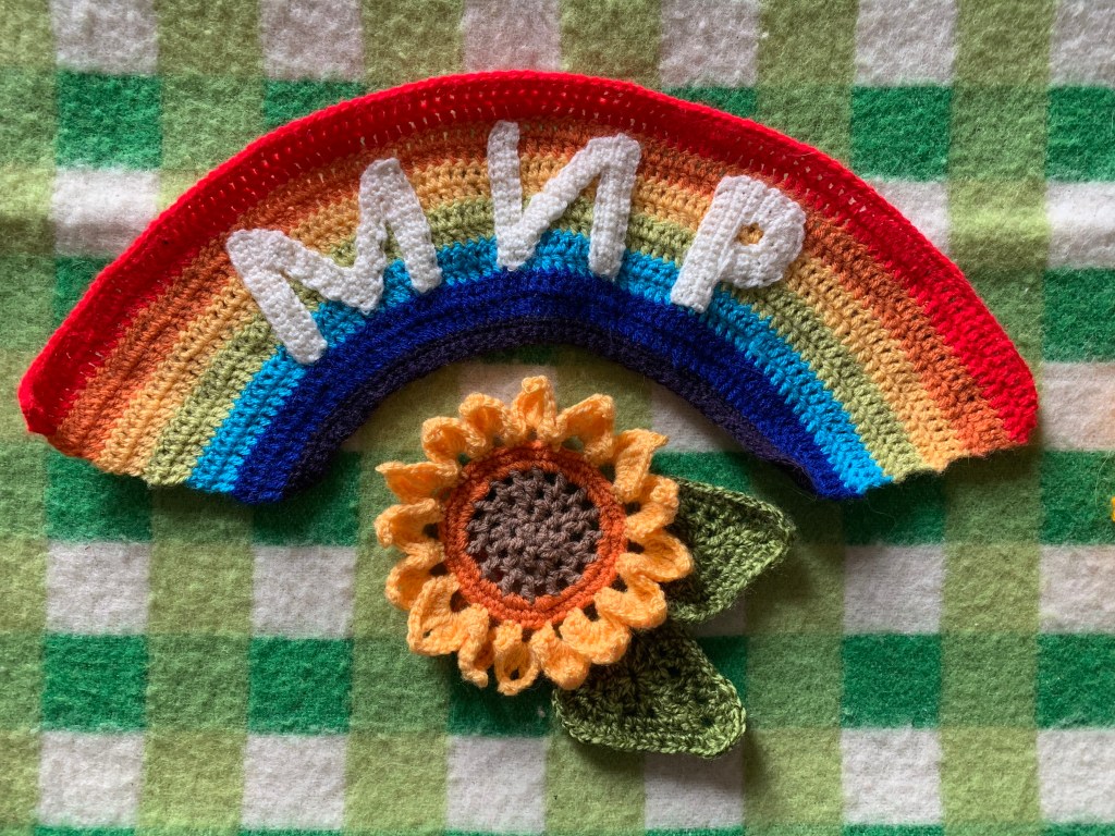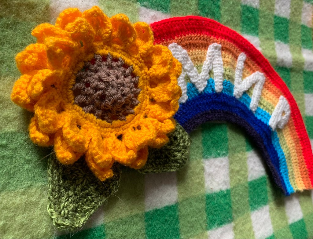 мир is Ukrainian for peace. Let’s yarn graffiti the world with sunflowers and rainbows for peace.
