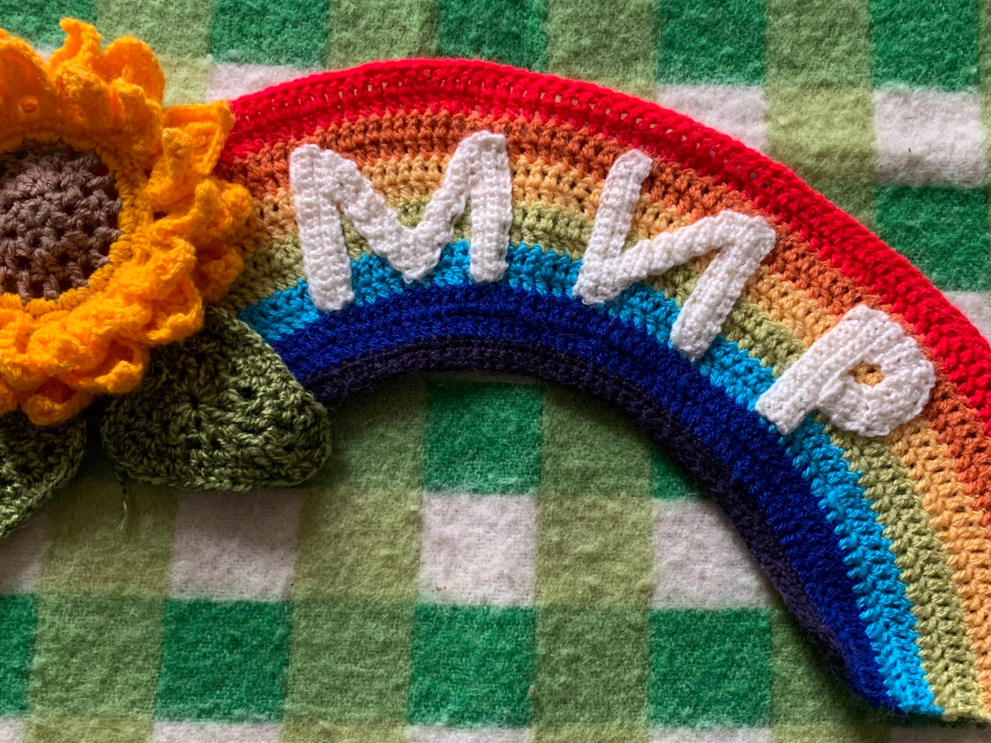 Sew in ends, and attach the letters to the centre of the rainbow. Make sure to stretch the letters slightly so that they don’t pucker the rainbow.
